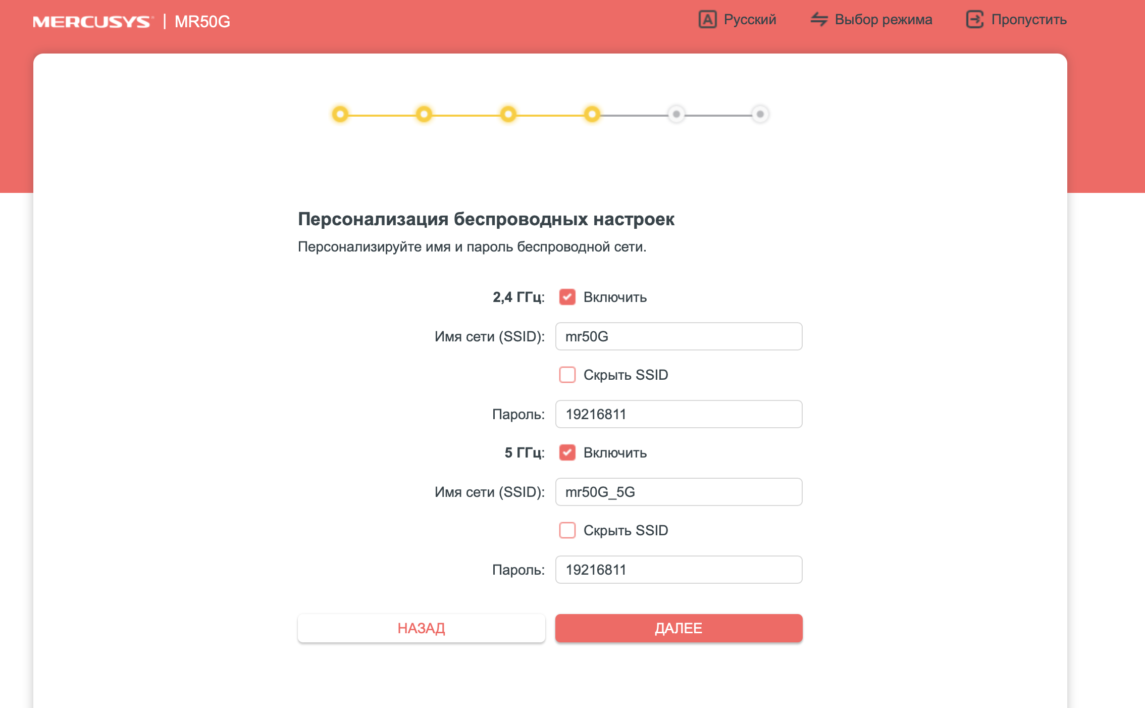 Шаг 3. В настройках роутера введите имена Wi-Fi-сетей и пароли к ним и нажмите «Далее», т.е стрелку чуть ниже;